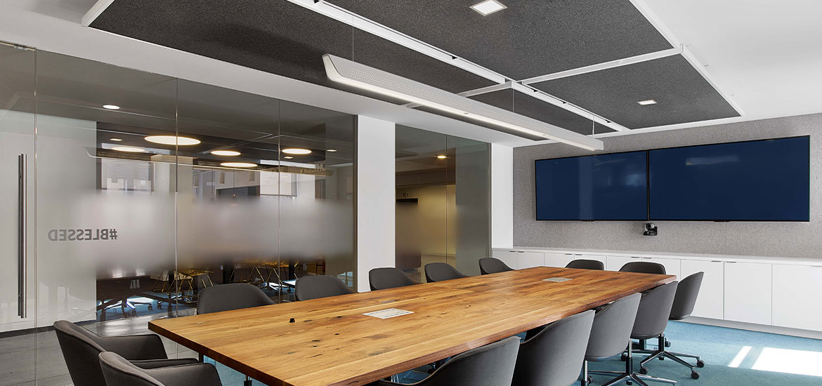 Metal asma tavan, ahşap asma tavan ve camyünü asma tavan sistemleri baffle asma tavan panelleri ile toplantı odası ses sistemlerini gizlemek ve akustik düzenleme sağlamak artık çok kolay.